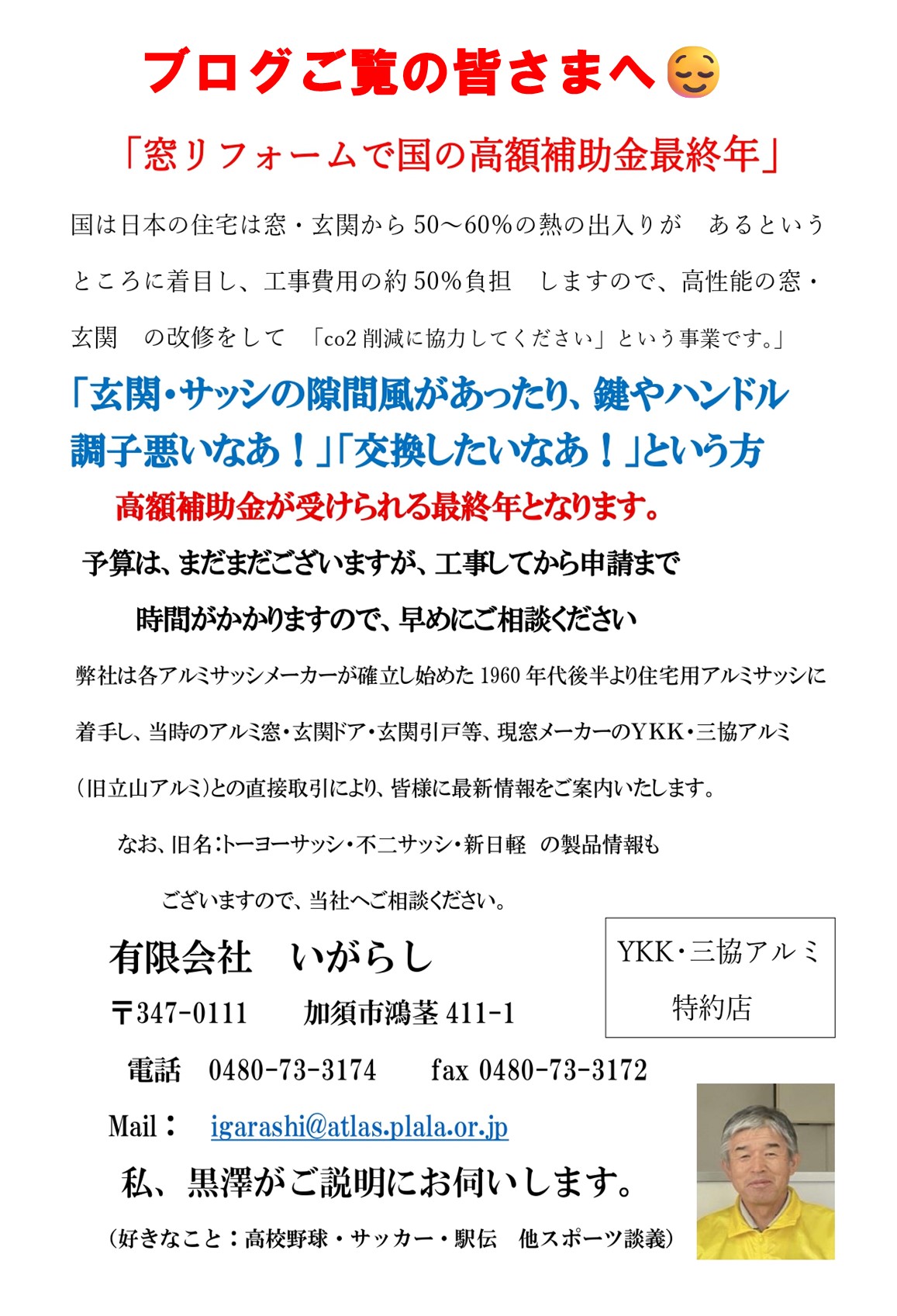 **私、「いがらしの黒沢」**が、補助金制度の詳しいご説明から、お客様のお家に最適な高性能な窓・玄関のご提案まで、丁寧に対応させていただきます。どうぞお気軽にお声がけください!