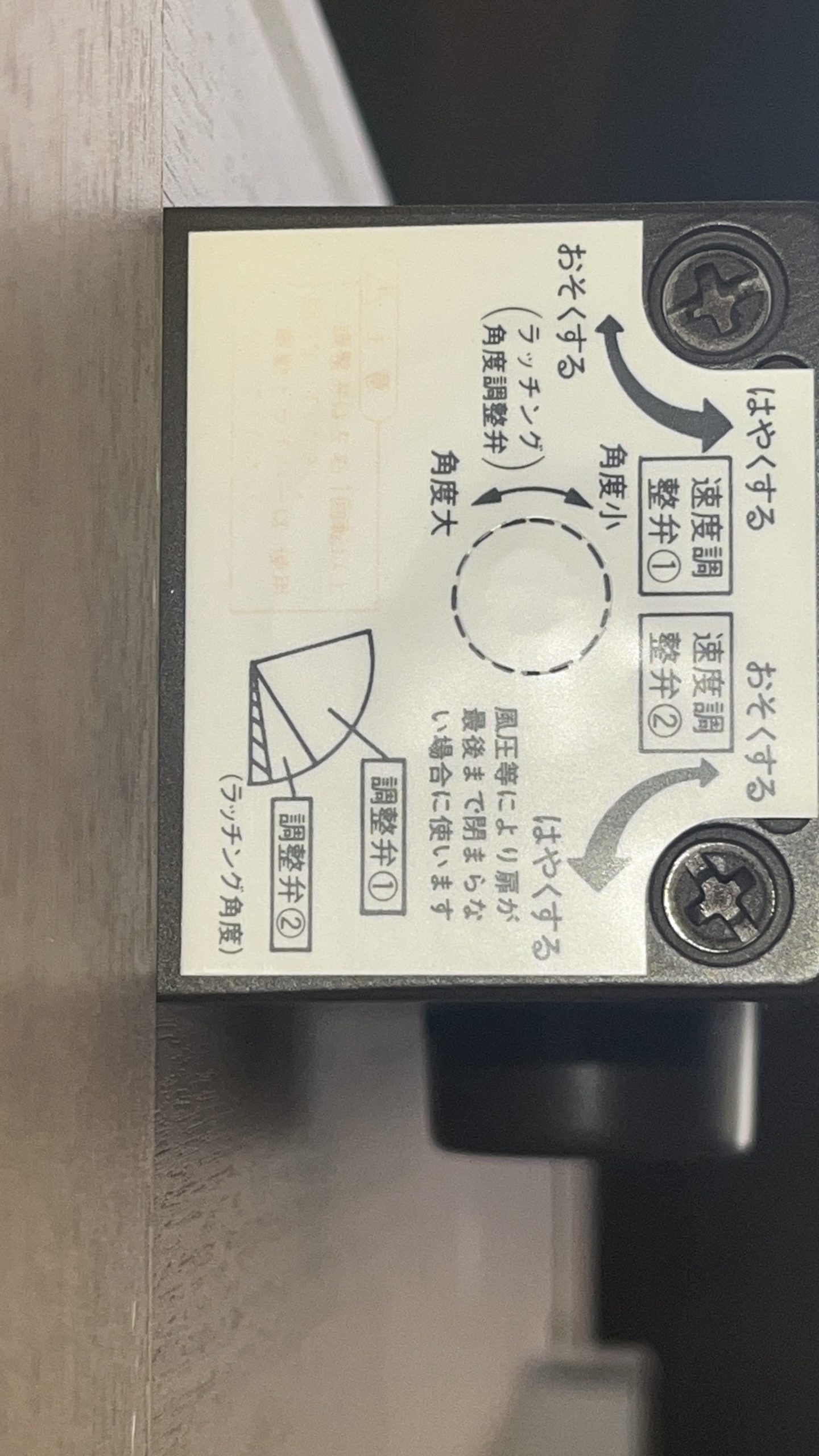2. 時計回り(右)にねじを回すとドアの閉まる速度が遅くなり、反時計回り(左)に回すと速くなります。試しに1回1/4回転(90°)ずつ調整してみてください。その都度確認!😊