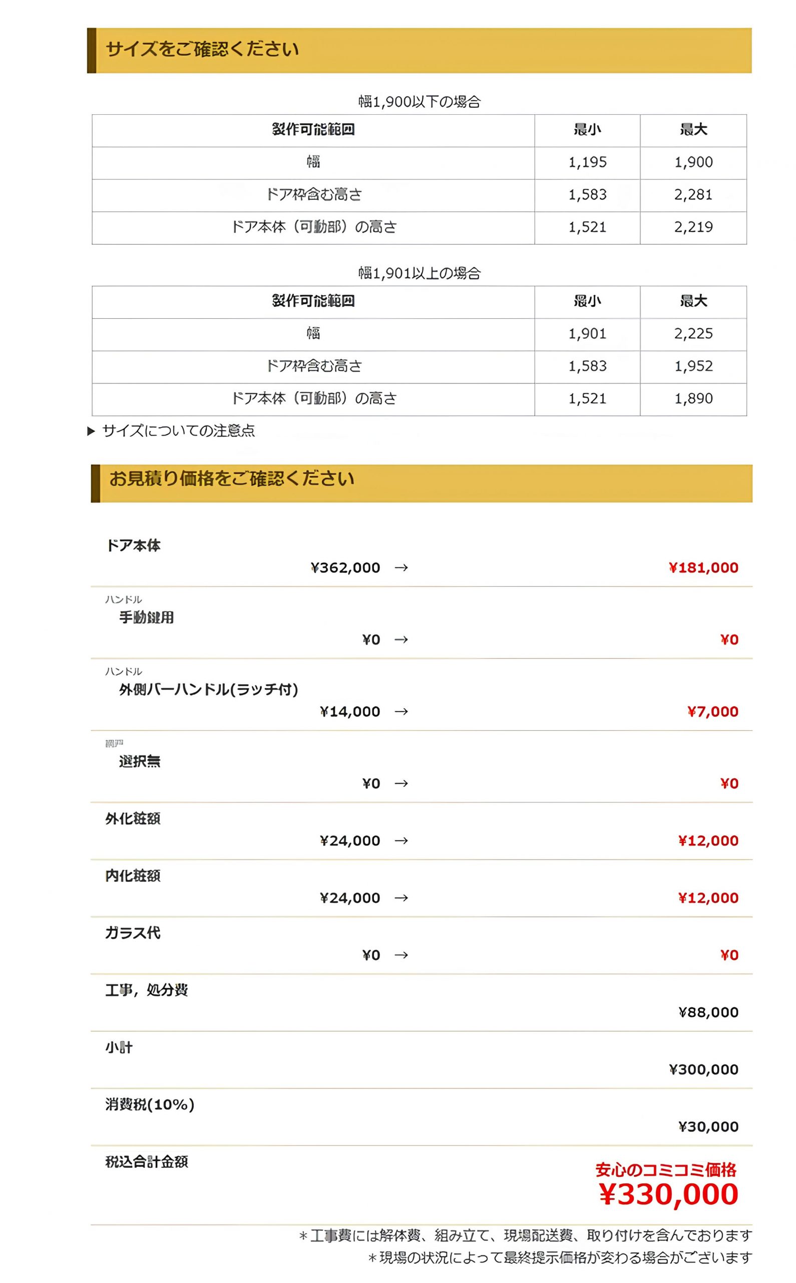 全ての条件にご協力いただけた場合、工事完了時に 合計15,000円分の特典 をご利用いただけます!🛠 商品情報お客様にお選びいただける商品は以下の通りです:• 浴室二枚折りドア:¥80,000(税抜)• 浴室框ドア:¥98,000(税抜)※上記価格は材料費・工事費・処分費を含まない税抜価格です。