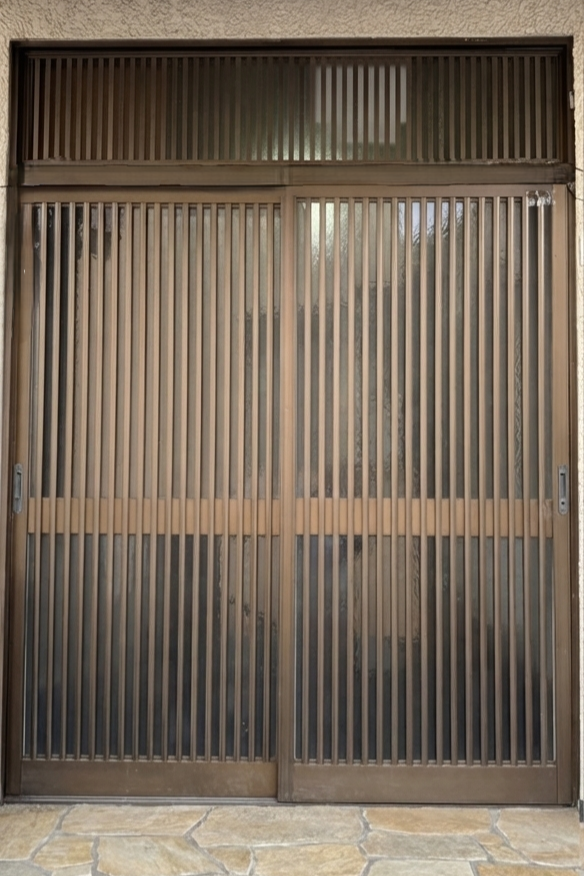 長年使われてきた玄関引戸は、枠の歪みや戸車の劣化によって動きが重くなり、無理に力を入れないと開かない状態に…。