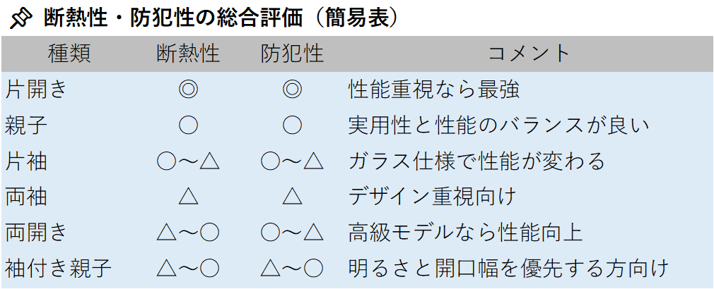 断熱性重視なら片開きが最も安定 ガラスが多いタイプは、Low-E複層ガラスを選ぶと性能が向上します。