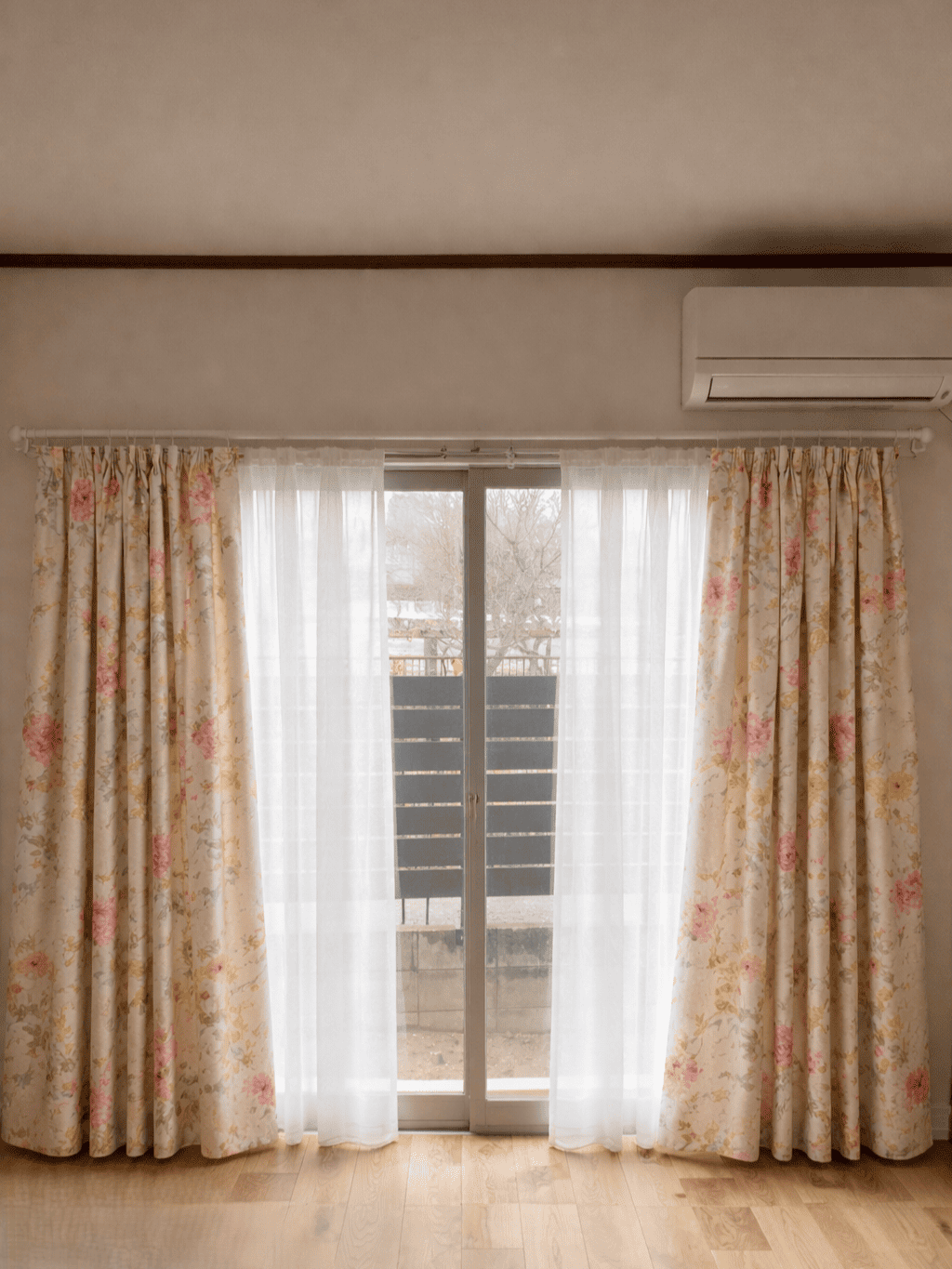 ✔カーテンの見直し (断熱カーテン、厚手+遮熱・断熱レースの二重掛けで冷気の侵入をブロック🪟)