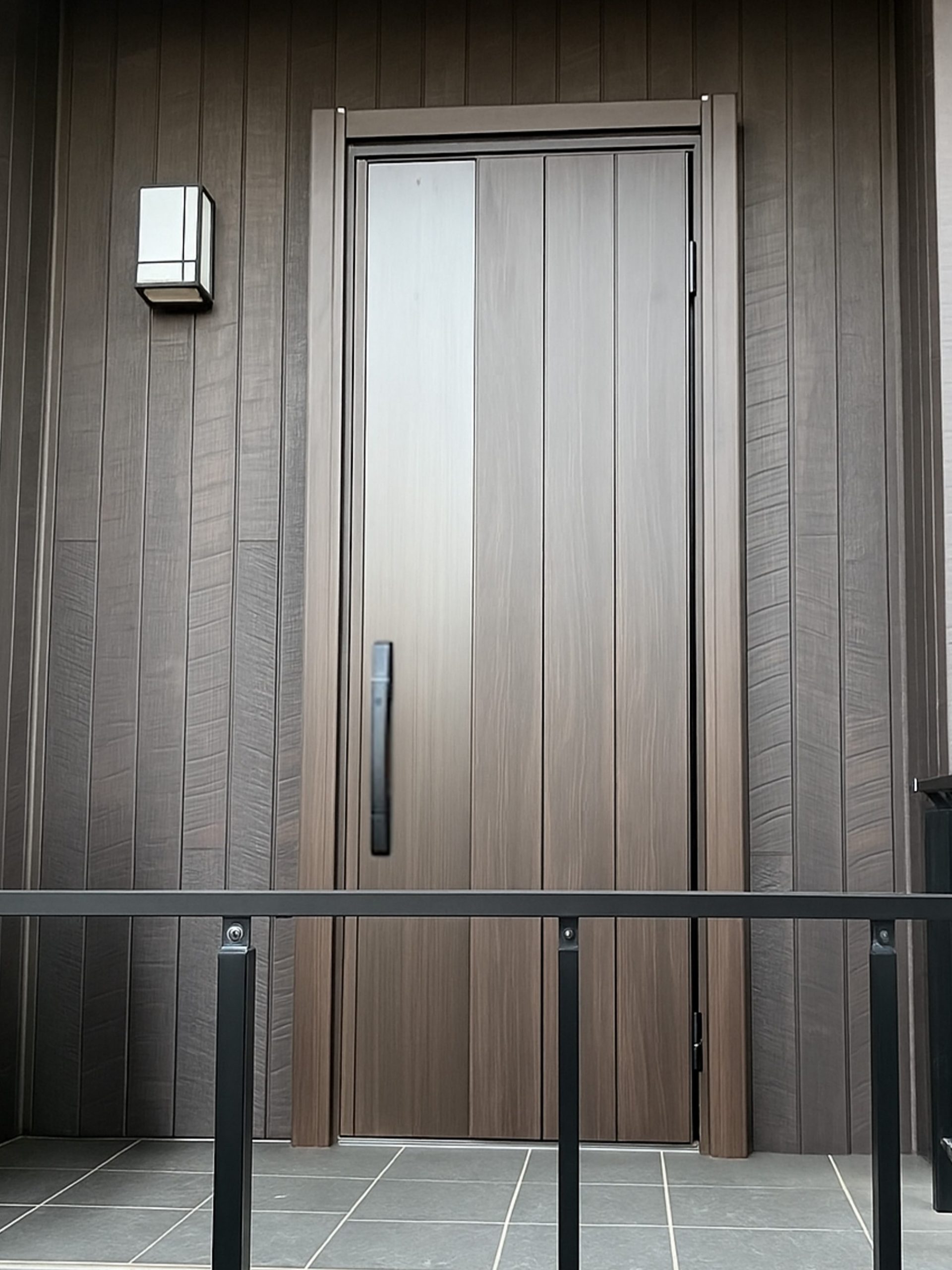 お選びいただいたステインウォールナット色の新しい玄関ドアは、外壁と見事に調和し、見違えるほど美しく玄関を映えさせています。