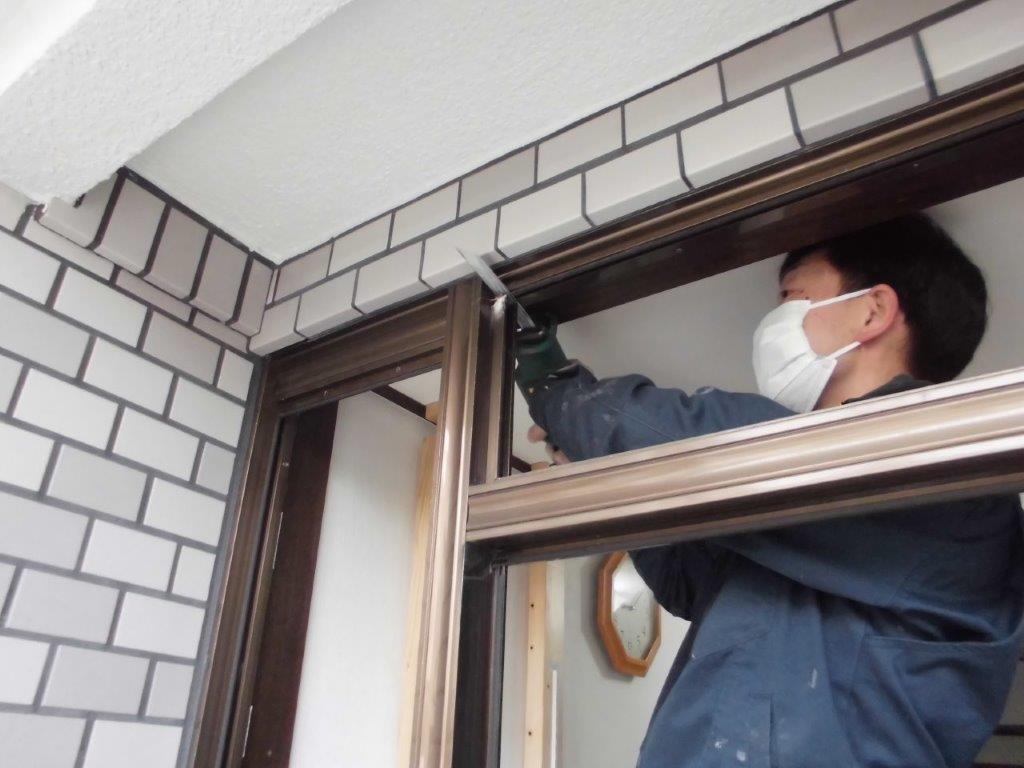 既存玄関ドアを取り外し、ランマ部片袖FIX部の硝子を取り外し、方立て、無目部をレシプロソー等を使用し切断していきます。