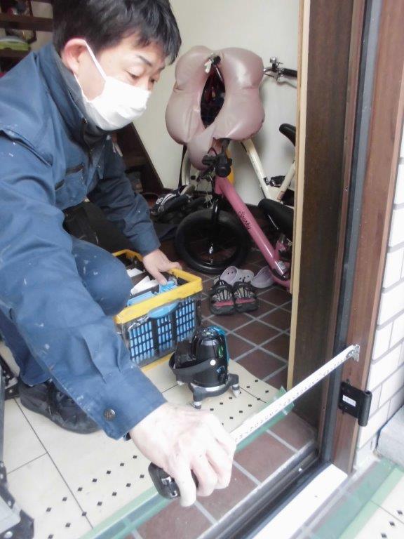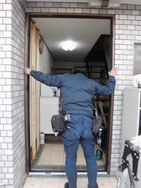 枠に歪みが無いように、水平・垂直をキッチリ確認しながら新しい玄関ドア枠を取り付けていきます。