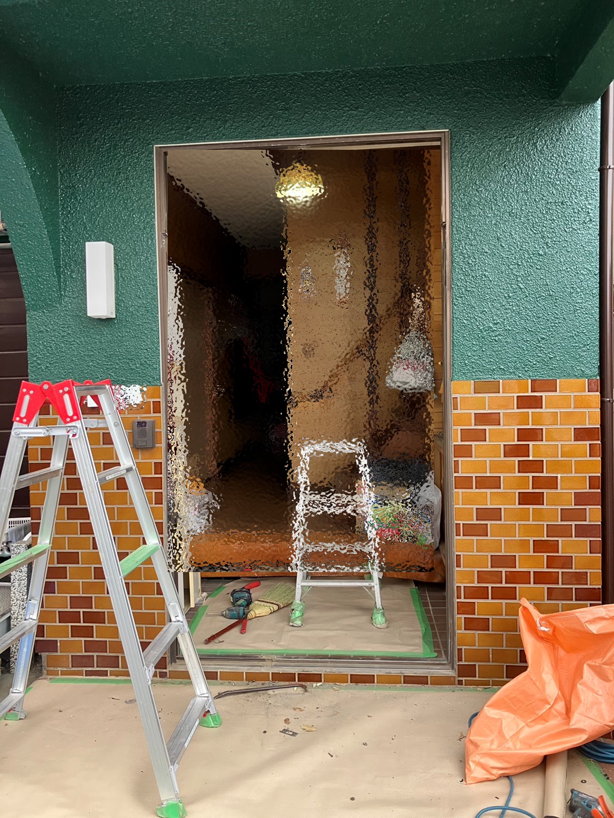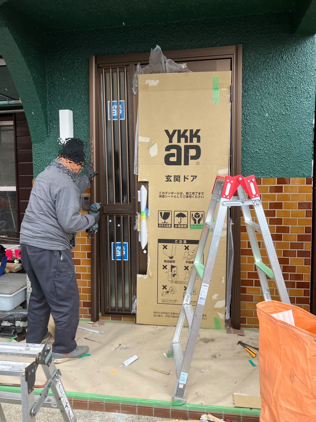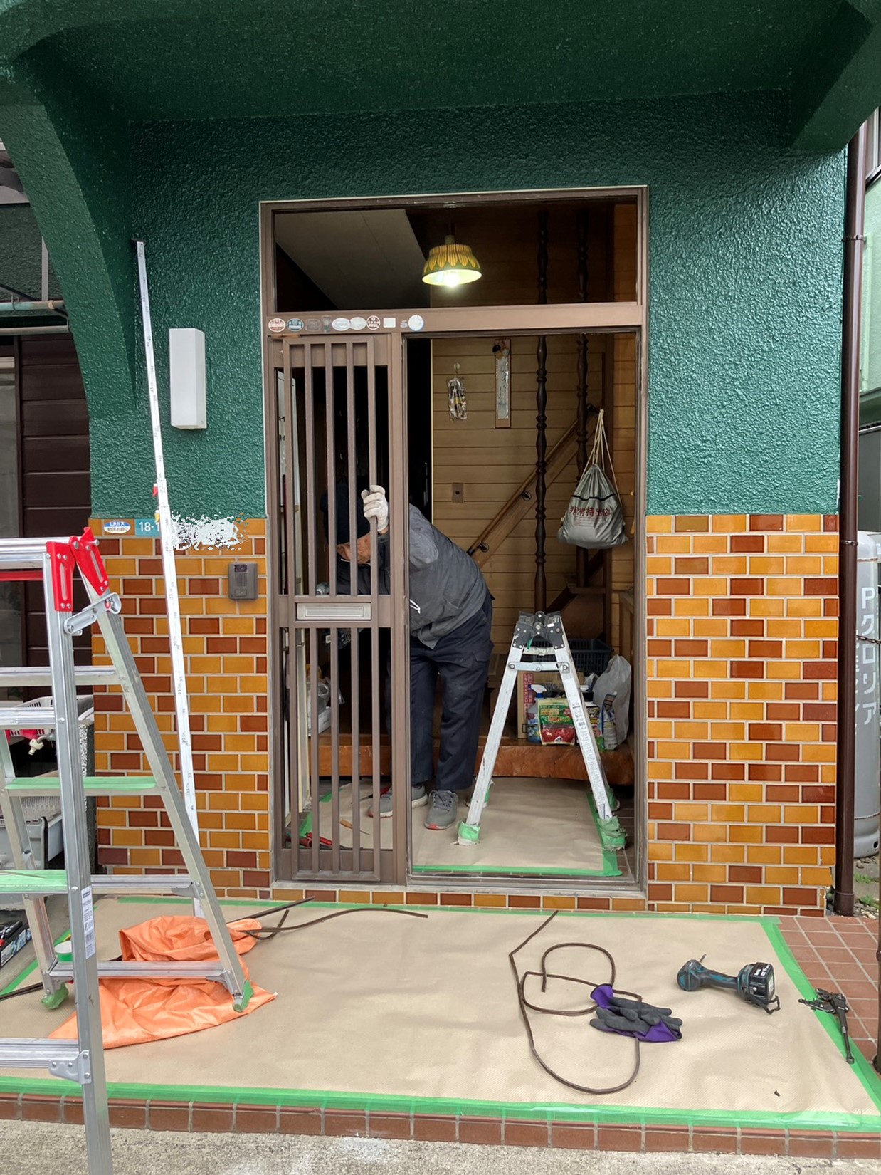 工事当日は、まず古い既存ドアの建て付けを慎重に確認しながら撤去に入りました。外壁タイルとの取り合いがタイトだったため、職人は工具を使い分け、タイルを傷つけないよう細心の注意を払って作業を進めています。