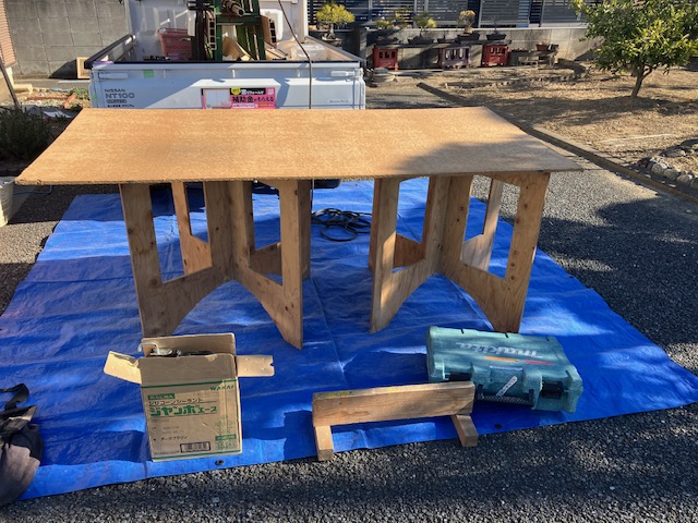 お客さま邸宅はお庭も広いので、今回は簡易工事テーブルを持ち込んで、施工開始です。これがあるとないのでは、その後の施工進捗や部品加工の出来映えがグーンと変わります。😄