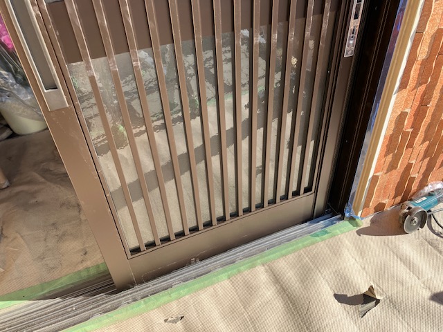 左の玄関引戸をセットしします。引戸枠が正しい位置なのか?動作は正常なのか確認をしていきます。