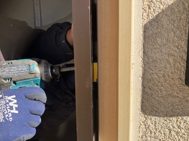 外額縁を収めていきます。しっかりとビス止めで取り付けて行きます。そのあとは外額縁周りのコーキング(防水処理)です。