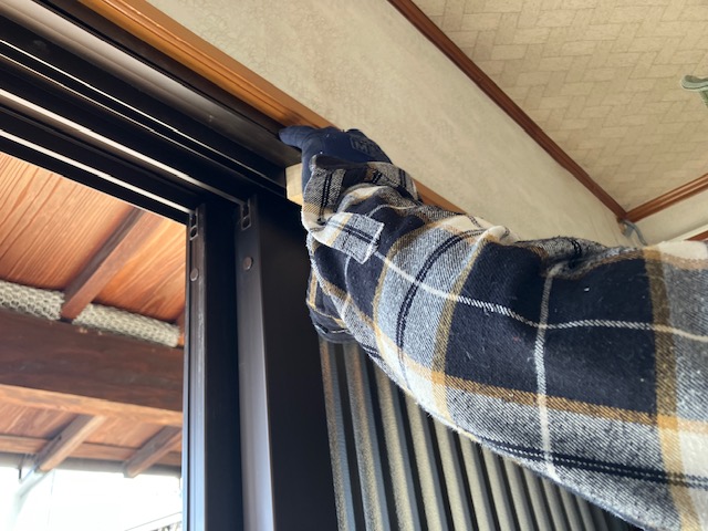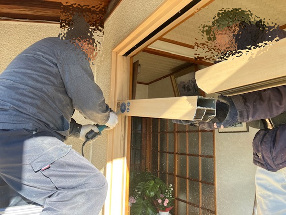 カバー工法なので既存玄関枠を撤去しています。ランマの無目を切断、今回は二人作業なので順調に取り外すことが出来ました。