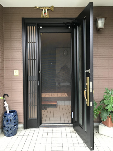 長年使ってきた網戸は、少しずつ動きが渋くなったり、ある日急に開閉できなくなったりと、生活の動線に直結する不具合が起きやすい部分です。今回は省スペースで使いやすく、見た目もすっきりする横引きロール網戸をご提案し、現地状況に合わせて納まりを整えました。毎日出入りする玄関だからこそ、操作性と安心感の両立がポイントになります。施工間の状態は、玄関ドア本体と袖部(縦格子の入った採光部)がある構成で、土間タイルまで含めた玄関内側の様子が分かります。網戸の設置・交換では、単に網戸本体だけを見るのではなく、開口部の形状や周辺の納まりがとても重要になります。特に玄関は枠まわりが複合的になりやすく、設置方法によって使い勝手や見栄えが変わってくるため、現場で丁寧に確認しました。