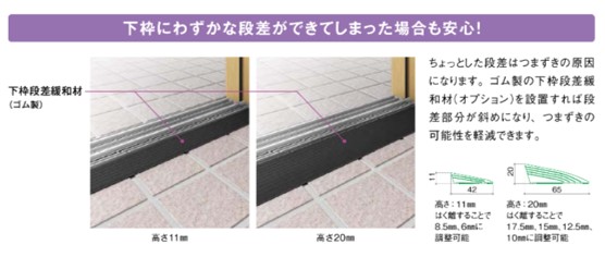 カバー工法によって生じる段差には、下枠段差緩和材という部材を使います。この部材は、黒い三角形のゴム材で、室内側に設置します。段差は最大2㎝までカバーできるので、カバー工法によって生まれるちょっとした段差からつまずきのリスクを軽減することができます。