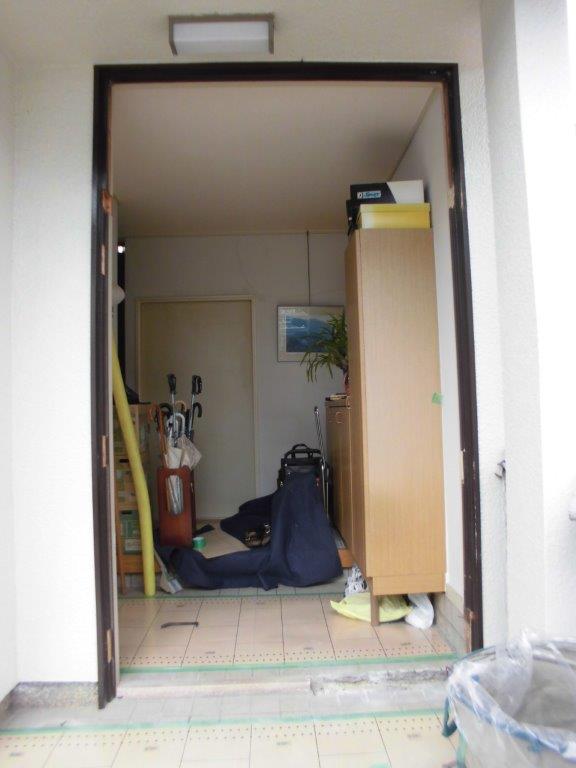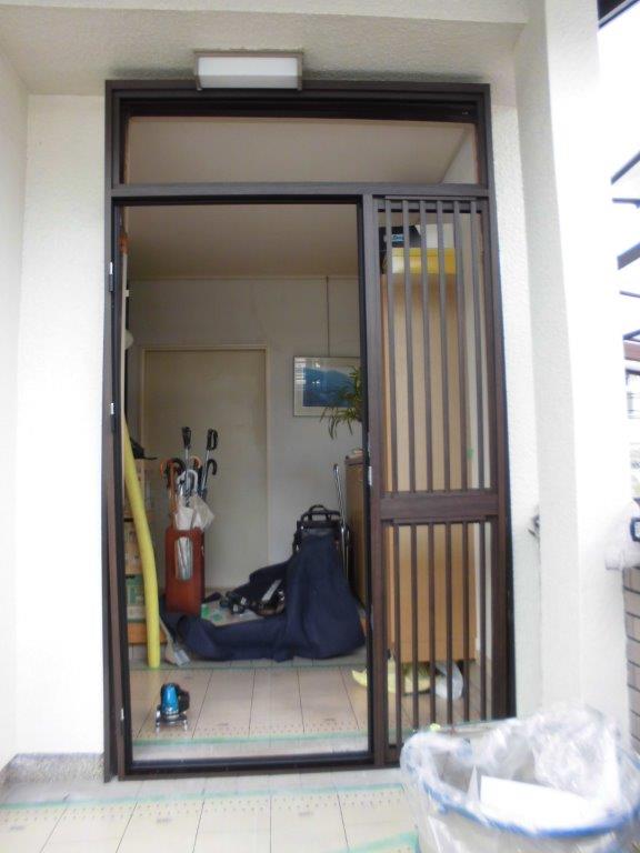 築30年以上が経過し日射、雨等でドア本体の表面が所々剥がれ、開閉もしにくくなっていたため。