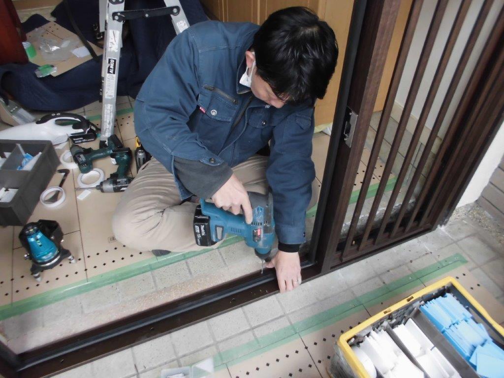 既存の枠の中に新しい枠を取り付けていきます。この時、新しい枠に歪みが無いように、水平、垂直を確認しながらしっかりと取り付けていきます。
