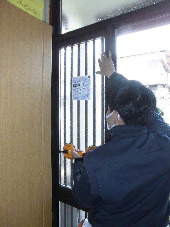 新設ドア枠のビス止めが全て完了しましたら、ランマ部袖部に複層ガラスをはめ込み、押えゴムで固定していきます。